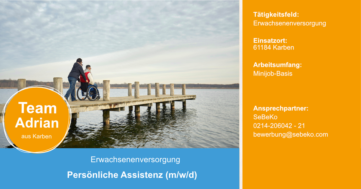 Zur Unterstützung meiner bereits festangestellten Assistenzkraft, suche ich ab sofort eine weitere Assistenzkraft (m/w/d), die mich auf Minijob-Basis, vor allem an Wochenenden, sowie als Vertretung bei Urlaub und Krankheit unterstützt.