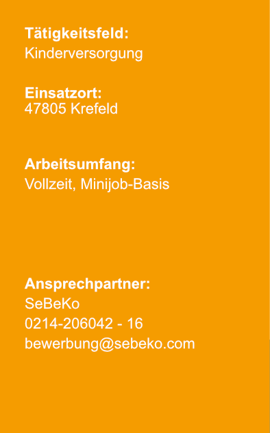 Ich freue mich auf eine engagierte Unterstützung, die mich sowohl zuhause als auch im Kindergarten begleitet. Ich höre gerne Musik, bekomme vorgelesen, spiele auf dem Spielplatz und mag Rollenspiele.