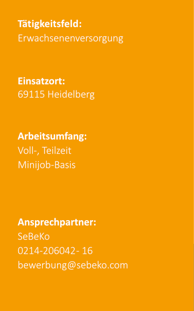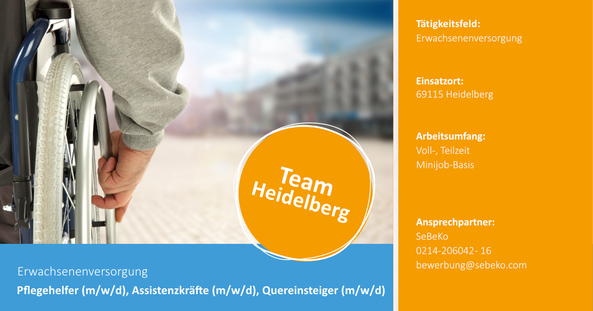 Deine Bewerbungsunterlagen sendest du bitte mit dem Betreff „Team Heidelberg-Bergheim“ an die Firma SeBeKo unter bewerbung@sebeko.com. Bei Fragen darfst Du Dich auch gerne unter 0214-20604216 melden.